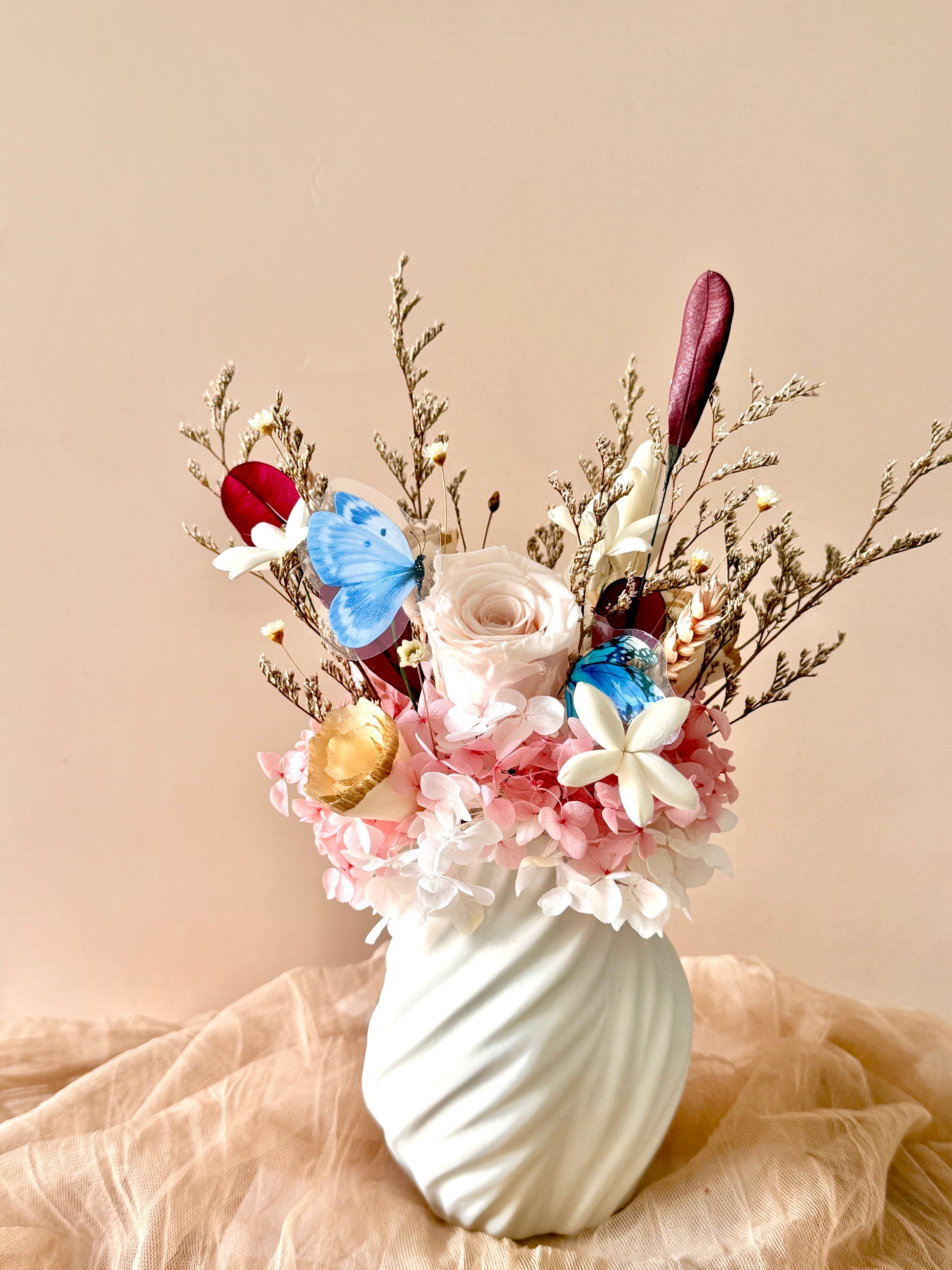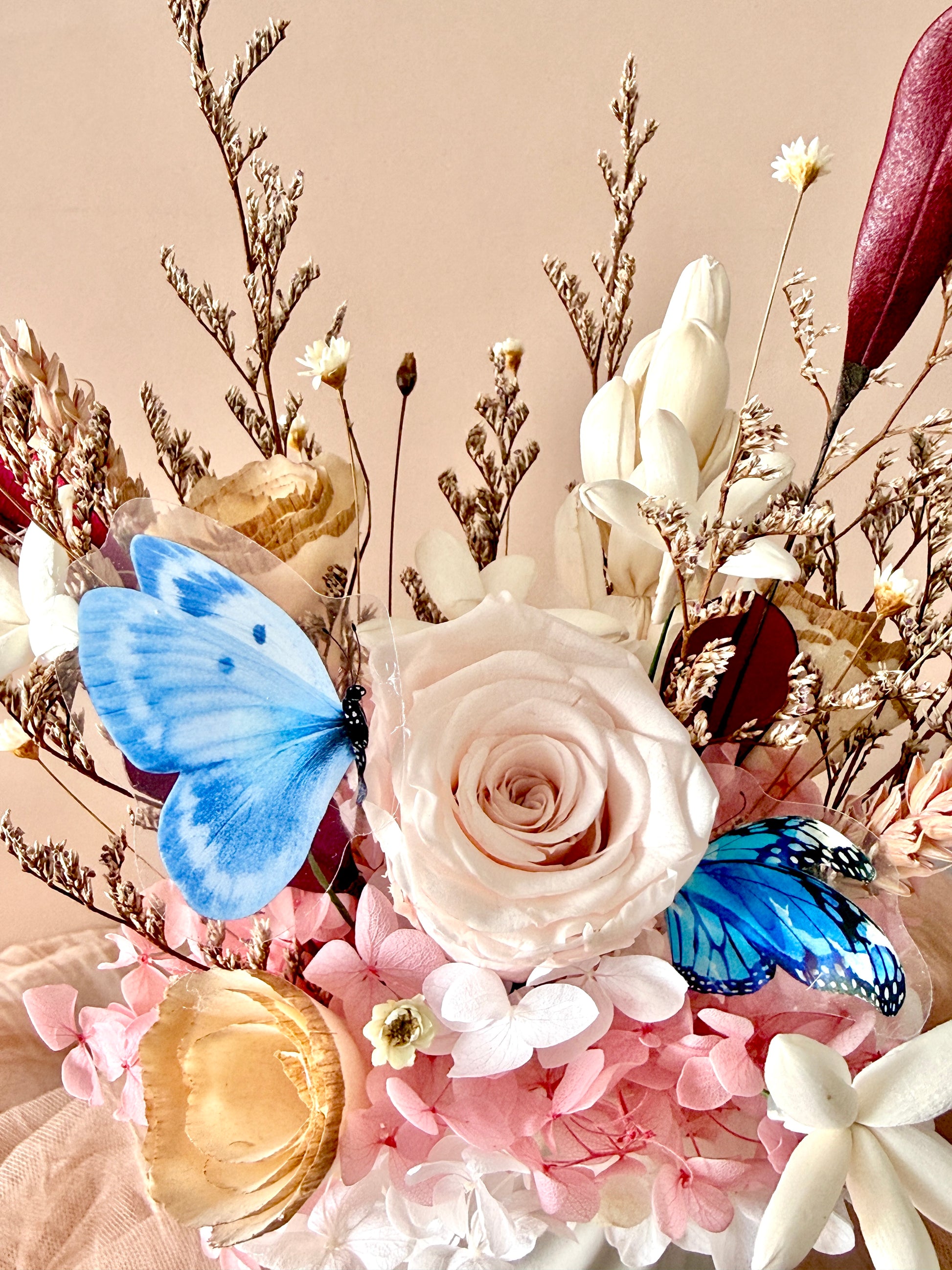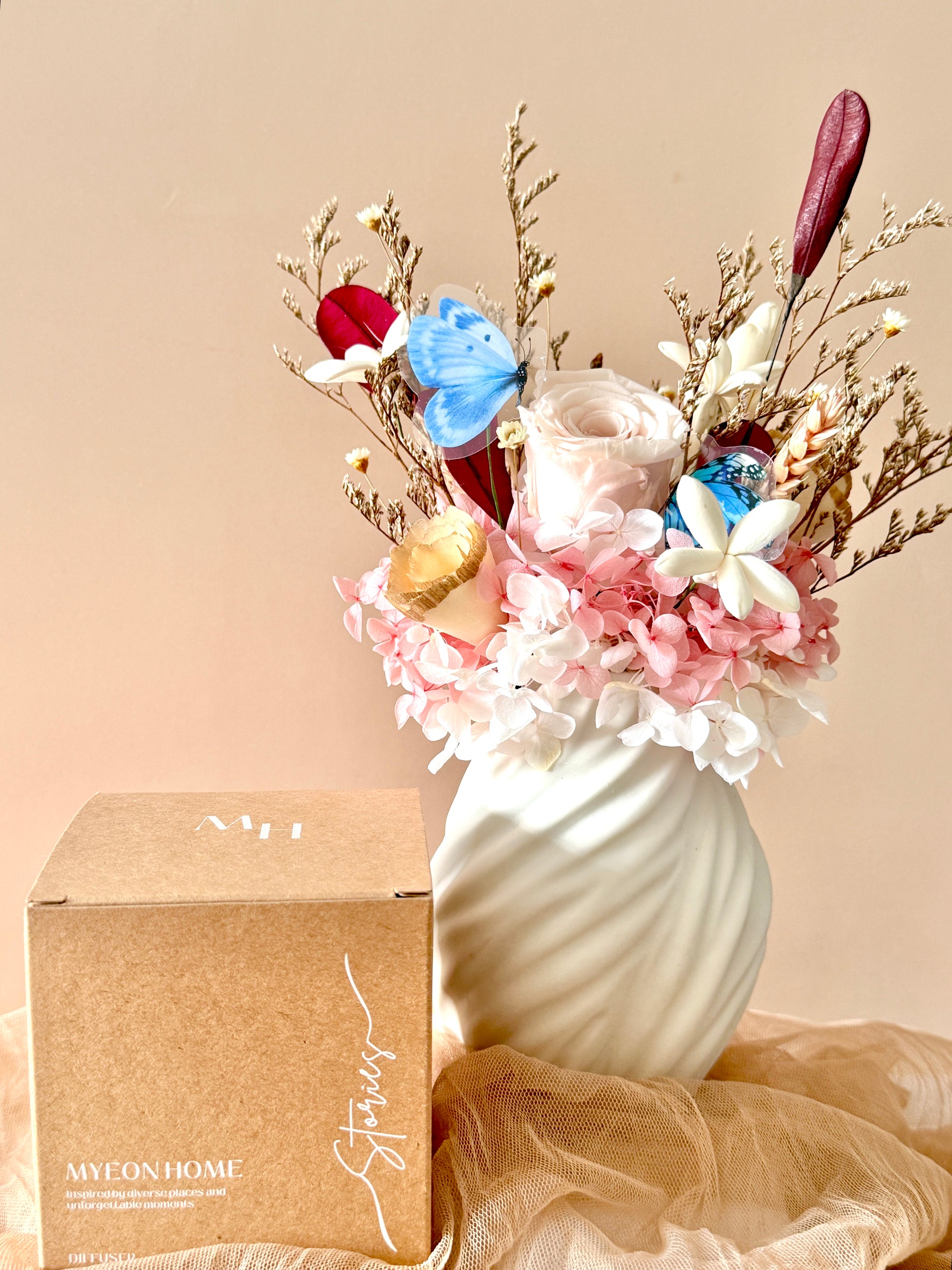 Centered around a graceful rose with fluttering butterflies and gentle movement, elegant and classic. Each set comes with vintage rose diffuser and a floral arrangement.